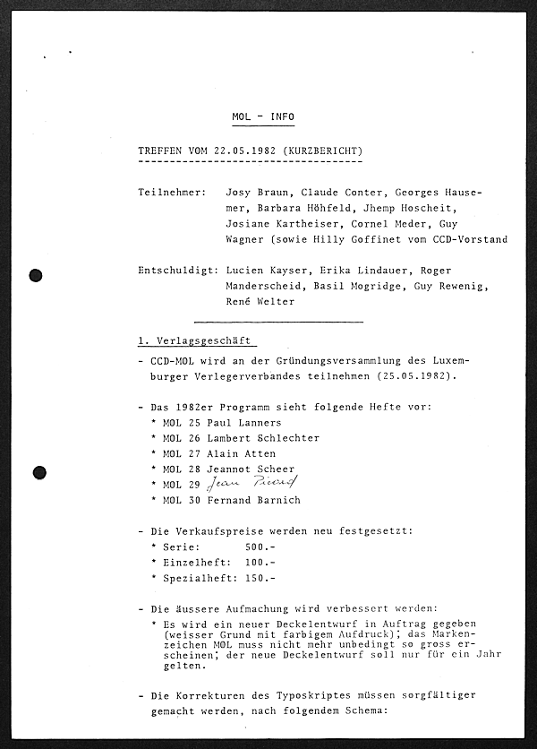 Dass mehrere Bestände des Literaturarchivs Spuren von Meders verlegerischen Initiativen enthalten, weist auf die Bedeutung der Zeitschrift und Schriftenreihen für viele Luxemburger Autoren hin; es unterstreicht zudem ihre Relevanz für die Entwicklung des Literaturbetriebs im Allgemeinen. Ein interessantes Beispiel dafür ist der Nachlass von Roger Manderscheid (CNL L-365), in dem sich Unterlagen und Artikel sowohl zu impuls und doppelpunkt als auch zu MOL befinden. Als besonders aufschlussreich erweist sich ein vierseitiges Dokument, das auf den 24.05.1982 datiert und mit dem Titel »MOL-Info« versehen ist (L-365, II. 1982-1983-008). Es handelt sich um ein Protokoll, das die Ergebnisse einer Versammlung vom 22.05.1982 festhält und Einblicke in die Organisation und Zielsetzung der Schriftenreihe erlaubt.