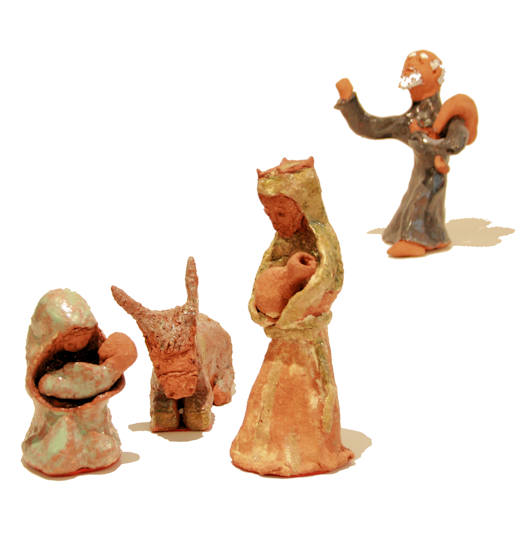 Dieses kleine Stück Bethlehem hat Lex Jacoby in den 60er Jahren aus Lehm geformt. Später kamen noch ein Kameltreiber und sein Kamel hinzu. Das Kamel ist längst den Weg alles Zerbrechlichen gegangen, und der Kameltreiber wirkt nun mit seinem ausgestreckten Arm, an dem er einst das Kamel führte, seltsam orientierungslos. Oder sucht er den Weg nach Bethlehem? Am Ende des Traum des Abraham finden die Hirten das Kind.