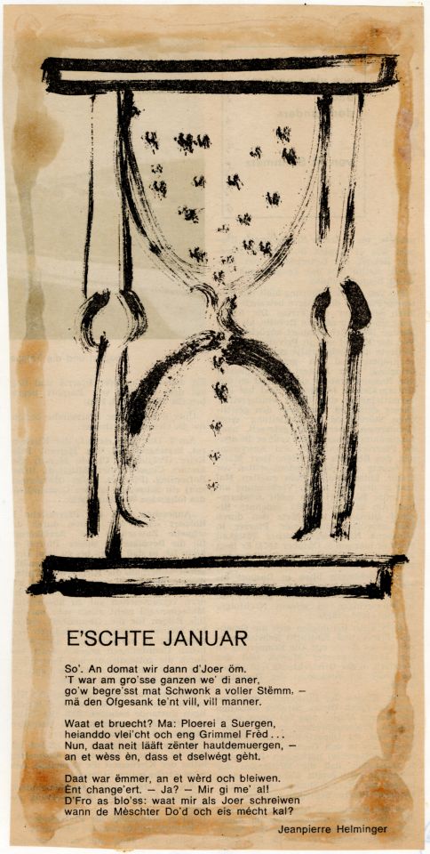 Mam Gedicht „E’schte Januar“ huet de Jeanpierre Helminger am éischte Lëtzebuerger Sonndesblad vun 1971 dat néit Joer begréisst. Hien schéngt wéineg enthusiastesch iwwert de Joresufank ze sinn an erënnert an deenen éischte sechs Zeilen dorunner, datt och d’Joer 1970 „mat Schwonk a voller Stëmm” begréisst gouf an awer näischt weider bruecht huet ewéi „Ploerei a Suergen” an heiansdo eng „Grimmel Freed”. Hien huet keng besonnesch Erwaardungen un dat neit Joer a resignéiert, datt et wuel esou wäert verlafen, ewéi all déi Jore virdrun, mat dem eenzegen Ënnerscheed, datt mir all méi al ginn. Déi eenzeg Fro, déi fir hie schéngt ze zielen, ass déi vum Moment vum eegenen Doud. Schonn den Ufank vum Gedicht – een eenzegt Wuert als éischte Saz – markéiert eng Realitéit a gläichzäiteg och eng Finalitéit a verbënnt esou den Ufank vum Gedicht mat sengem Schluss an der Fro nom Zäitpunkt vum eegenen Doud.