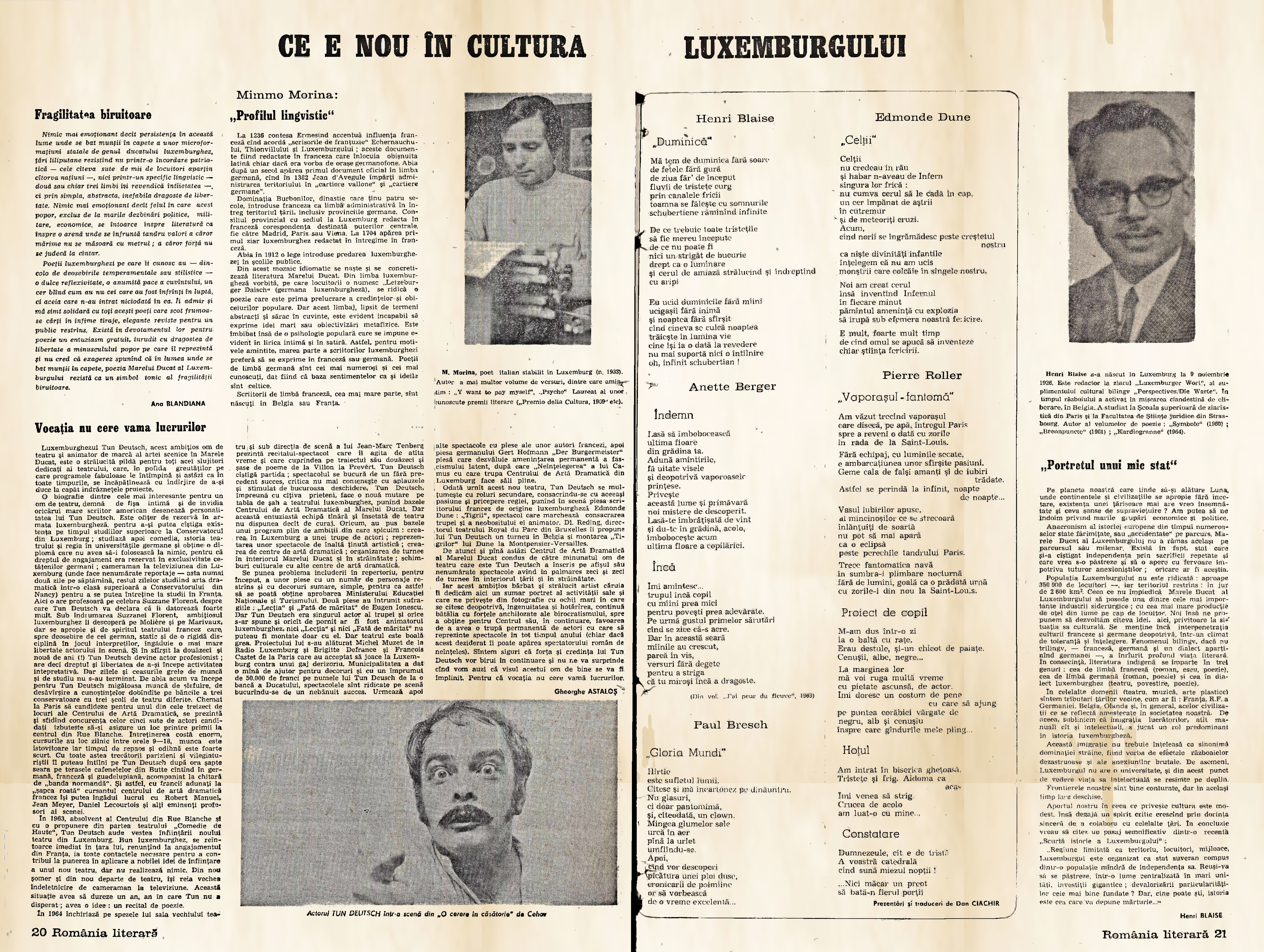 Es ist keine geringe Überraschung, in der rumänischen Presse des Jahres 1971 auf Luxemburger Literatur zu treffen. Die Kulturzeitschrift România literară veröffentlichte in ihrer Ausgabe vom 24. Juni tatsächlich einen doppelseitigen Beitrag zum Thema »Was gibt es Neues in der Kultur Luxemburgs«. Während die Poetin Ana Blandiana die Verdienste Luxemburger Dichterkollegen hervorhob, setzte sich der Theaterkritiker Gheorghe Astaloş mit der Biografie des Schauspielers Tun Deutsch auseinander. Auf Luxemburger Seite schilderte Mimmo Morina die linguistische Situation des Großherzogtums; Henri Blaise zeichnete das mentalitätsgeschichtliche »Porträt eines kleinen Staates«. Gedichte mehrerer Autoren gaben ihrerseits einen Einblick in die zeitgenössische Literaturproduktion. Bedenkt man, dass im Realsozialismus jede mediale Äußerung mit politisch-ideologischen Absichten unterlegt war, ist es lohnenswert, der Frage nachzugehen, welche Zwecke dieser Artikel bedient haben könnte.