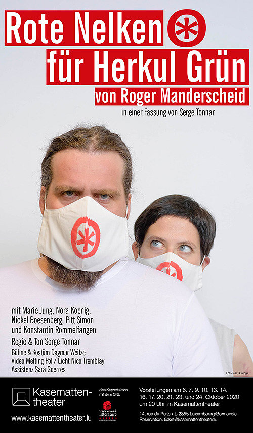 „Edmond Dune est le seul auteur luxembourgeois de langue française qui puisse être joué et il a des pièces. […] En langue allemande, il y a un jeune, Manderscheid, qui vient d’être joué à la radio. Mais pour le moment, c’est tout ce que je vois!“ meinte Tun Deutsch, der Gründer des Kasemattentheaters, im Jahre 1971 in Bezug auf Luxemburger Bühnenautoren. Kurz darauf (1974) schrieb der noch junge Roger Manderscheid (1933-2010) das Stück „Rote Nelken für Herkul Grün“, als Auftragsarbeit für das Kasemattentheater - das Stück in seiner Originalfassung wurde jedoch nicht aufgeführt, da es einigen Mitgliedern des Ensembles damals wohl als zu gewagt für das konservative Luxemburg erschien. Manderscheid veröffentlichte das Stück 1983 in abgeschwächter Form, überarbeitete es immer wieder und übersetzte es dann auch ins Luxemburgische, wie aus dem Fonds Manderscheid im nationalen Literaturarchiv (CNL) hervorgeht. Der dem Kasemattentheater angebotene Originaltext blieb jedoch in seiner Schublade und eine Kopie fand sich kürzlich im Literaturarchiv. Das Kasemattentheater hat also eine Rechnung offen: der damals als Provokation geltende Originaltext wird nun, 10 Jahre nach Manderscheids Tod, im Kasemattentheater endlich uraufgeführt. Als Regisseur fungiert ein heutiger Provokateur der Luxemburger Kulturszene, Serge Tonnar, und ihm zur Seite steht ein erstklassiges Schauspielensemble.